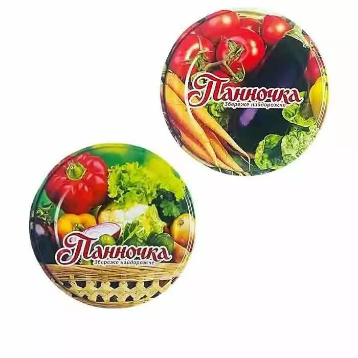 Практичні і надійні, кришки Панночка з літографічним повнокольоровим друком барвистих зображень овочів, вирізняються своїм яскравим дизайном. Вони виготовляються з якісної харчової жесті з подвійним зовнішнім покриттям харчового лаку і літографії та внутрішнім - харчової емалі і лаку.