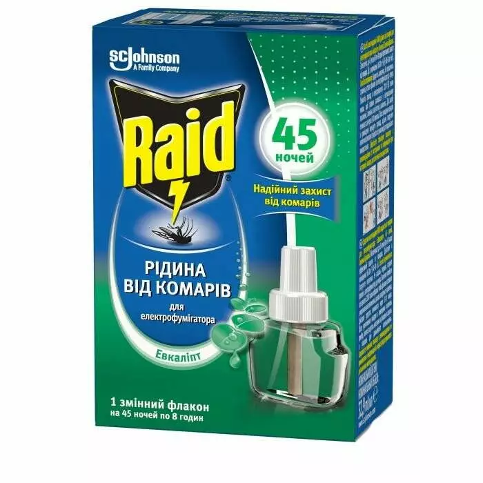 В наш час є великий вибір різноманітних засобів від комарів. Ми пропонуємо простий у використанні і доступний засіб рідину "Raid" з запахом евкаліпта для фумігаторів. Це відмінний захист від комарів та мух, безпечний для користування в домашніх умовах , але при цьому нещадний до комах. Препарат очищає приміщення повністю через 8-10 хвилин і підходить для всієї сім'ї.