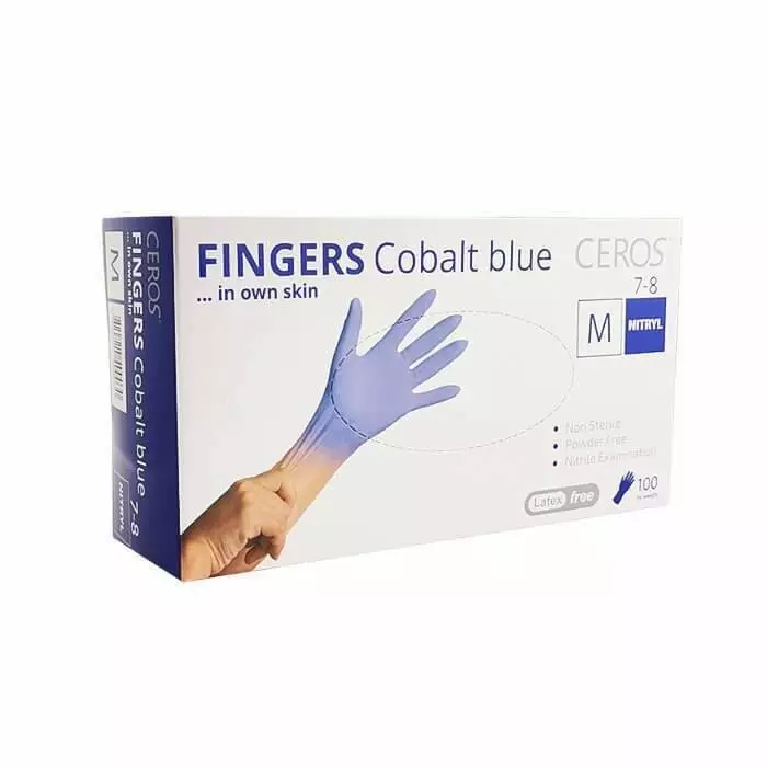 Рукавички нітрилові нестерильні неприпудрені CEROS Fingers® Cobalt Blue виготовлені з гіпоалергенного нетоксичного матеріалу: нітрил – штучного, синтетично отриманого каучуку і є заміною натурального каучуку. Неприпудрені, хлоровані. Текстурована поверхня долоні та пальців забезпечує комфортне та надійне захоплення. Ергономічні властивості цих рукавичок значно знижують розвиток втоми рук. Стійкі до проколів.