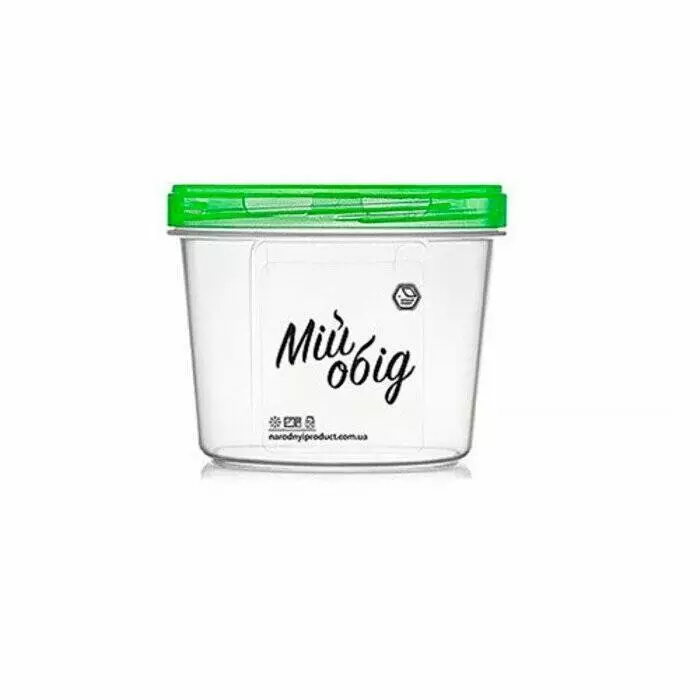 Судок харчовий прозорого кольору з написом "Мій обід", круглої форми, розрахований на 700 мл, з кольоровою гвинтовою кришкою для герметизації та призначений для багаторазового використання.
